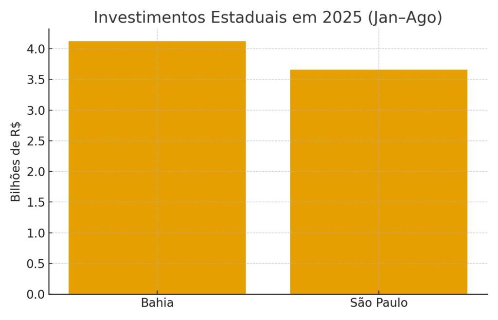 A Bahia abriu larga vantagem sobre São Paulo no ranking de investimentos estaduais de 2025 com R$ 4,12 bilhões aplicados entre janeiro e agosto, contra R$ 3,66 bilhões do estado paulista. Segundo dados do SICONFI (Sistema de Informações Contábeis e Fiscais do Setor Público Brasileiro) que reúne os relatórios fiscais dos estados. Trata-se da primeira vez em mais de uma década que a Bahia ultrapassa São Paulo em volume absoluto de investimentos apesar de representar uma fração da economia paulista. A administração estadual baiana já soma R$ 20,2 bilhões em investimentos desde o início da atual gestão.