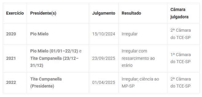 Fonte: Tribunal de Contas do Estado de São Paulo (acórdãos de 15/10/2024, 23/09/2025 e 01/04/2025)
